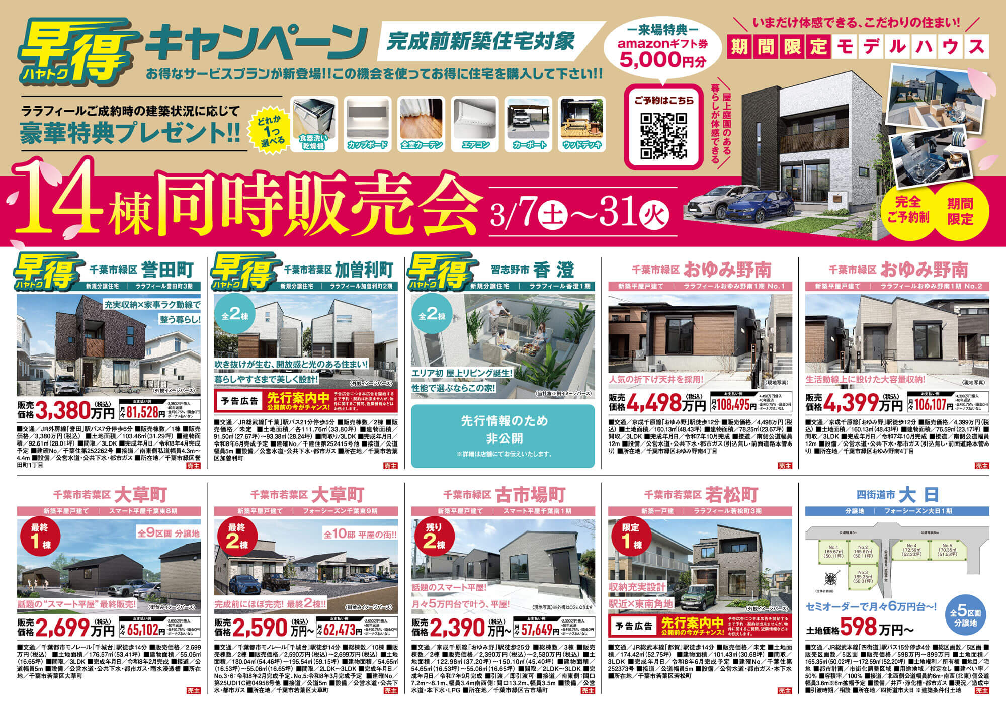 2026年3月7日(土)〜3月31日(火)まで、「14棟同時販売会」を開催! 人気の平屋から話題の屋上リビングまで幅広いラインナップをご覧いただけます。完成前の新築住宅が対象の「早得キャンペーン」も実施中。理想の暮らしをスタートするチャンスです。ご来場いただいた方にはAmazonギフト券5,000円分の来場特典もご用意! 「自分に合う家がわからない…」そんな悩みも、この「14棟同時販売会」で解決しませんか?
